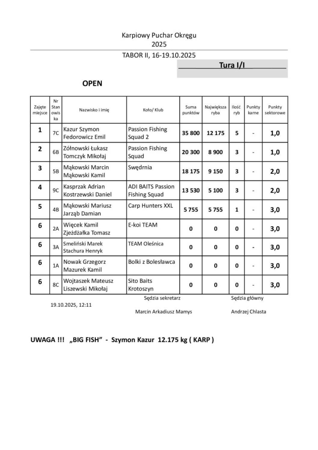 Po czterech dniach intensywnej rywalizacji najlepsza okazała się drużyna Passion Fishing Squad 2 w składzie Szymon Kazur – Emil Fedorowicz, zdobywając 35 800 punktów i łowiąc pięć ryb. W ich siatce znalazł się także największy karp zawodów o wadze 12 175 g, którego autorem był Szymon Kazur.