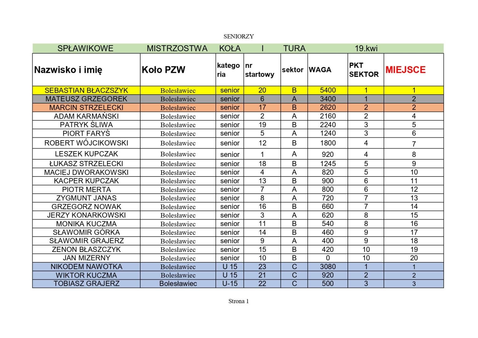 Nazwisko i imię Koło PZW kategoria nr startowy sektor WAGA   PKT  SEKTOR MIEJSCE